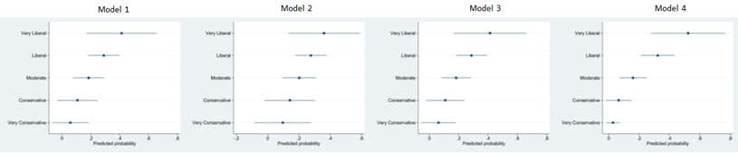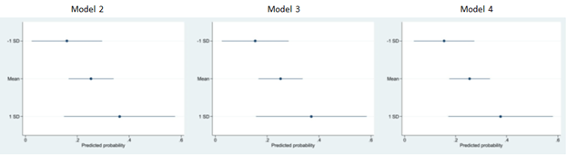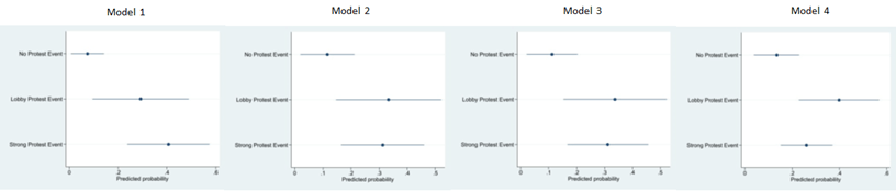 Online Appendix 3. Predicted Probabilities for Select Variables of Their Impact on Cities’ Likelihood of Taking a Strong Regulatory Response (Response = 3) to TNCs for all Models.